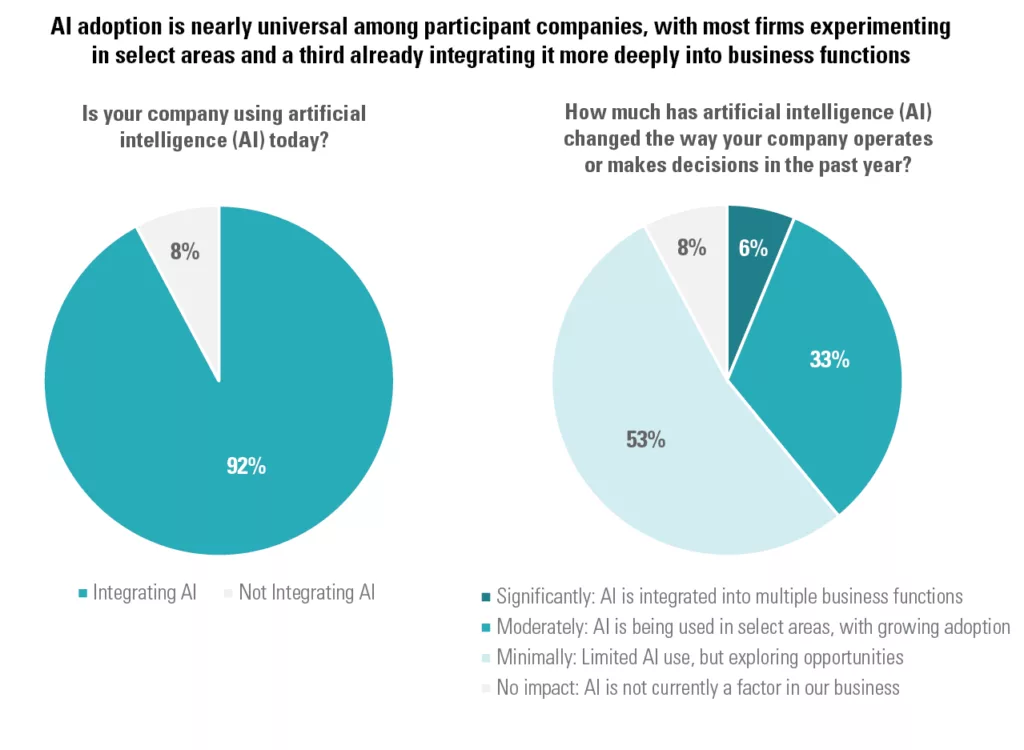 Over the past year, nearly nine in ten companies report some level of AI activity, yet the depth of integration remains limited. Just 6% say AI is significantly embedded across multiple business functions. One-third describe moderate use in select areas with adoption expanding, while a majority (53%) are still experimenting and exploring opportunities. Only a small minority (8%) report no current AI impact. Alongside AI, firms are layering in complementary tools to support decision-making and reporting: 57% are actively integrating business intelligence (BI) platforms, and a handful are experimenting with blockchain or other emerging technologies.