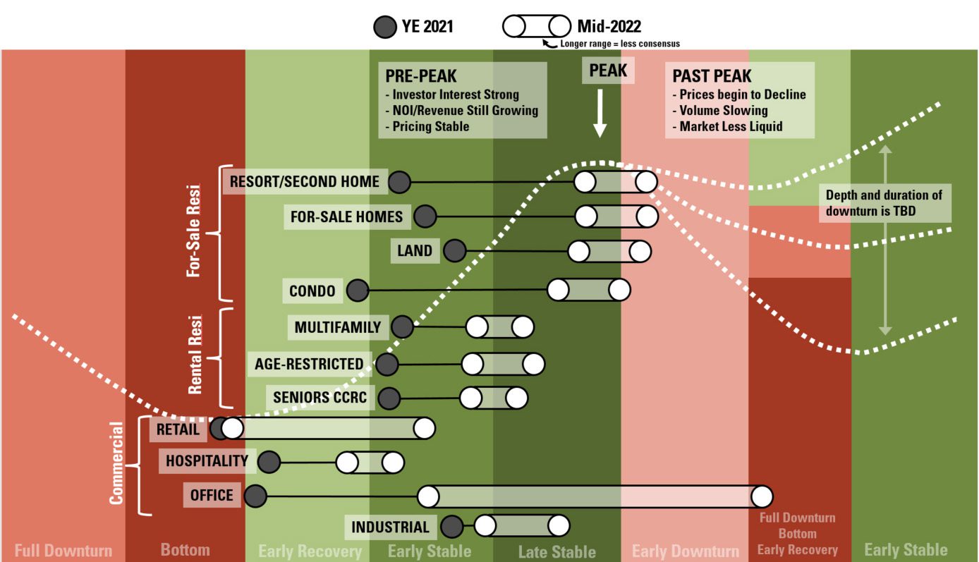 - Rental residential uses including multifamily apartment, seniors CCRC, and age-restricted rentals have relative consensus around being the expansionary stable phases.