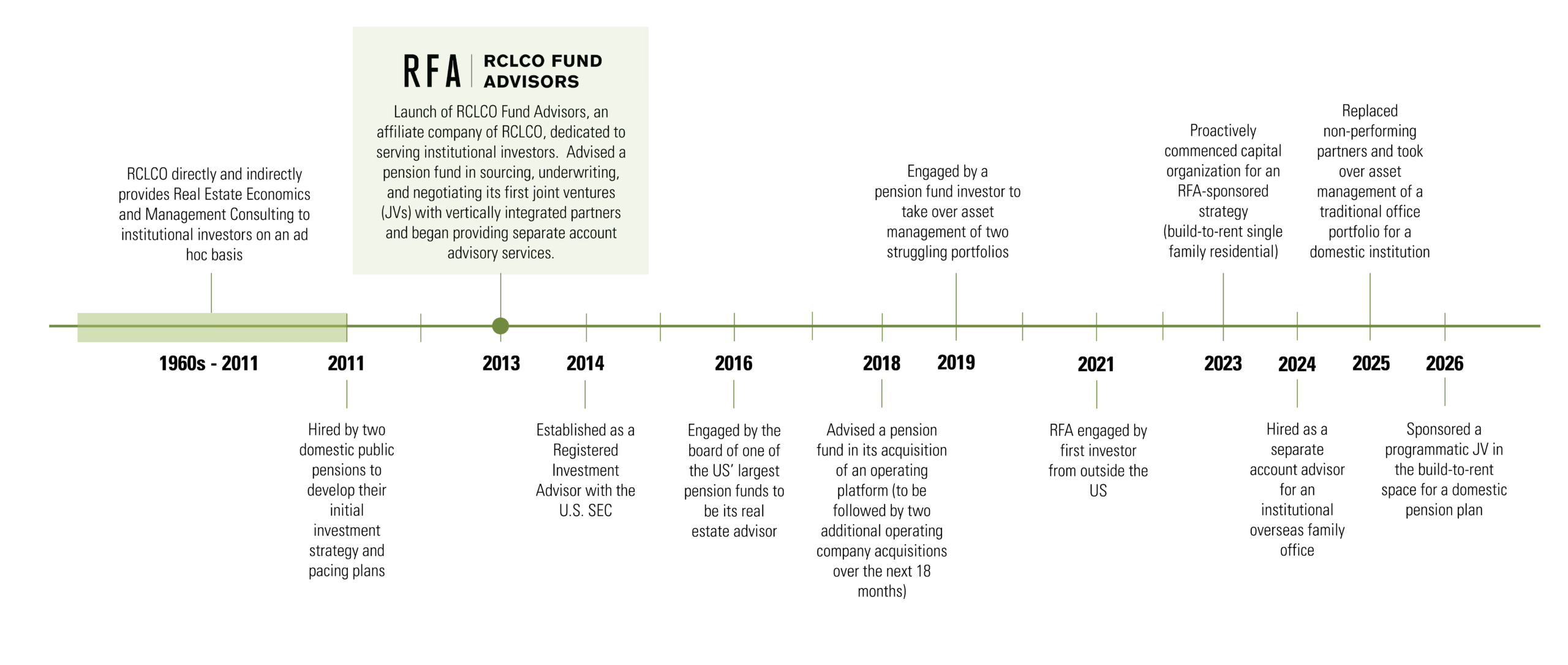 RCLCO Fund Advisors, LLC (RFA) was formed in 2011 to enable institutional investors to achieve their investment goals by having greater control over their real estate portfolios.